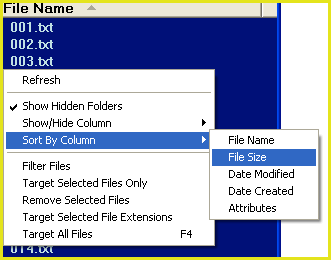You can sort your files by name, size, attributes or date. When you perform an operation on files, they will be worked on in the order that they appear in the main window.