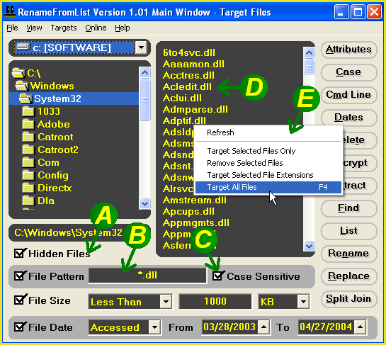 | If you wish to target all txt files but do not want to type in a pattern, you can select a txt file from box D and then right-click on box D. From menu E select "Target Selected File Extensions". This will enter a pattern of *.txt in box B and will tick box A for you.